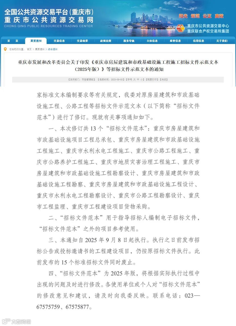 重庆市发改委关于印发《重庆市房屋建筑和市政基础工程施工招标文件示范文本(2025年版)》等招标文件示范文本的通知提到: