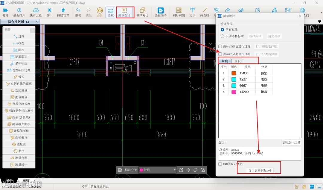 支持长度、面积测量数据统计,结果导出EXCEL,数据可直接用于清单计算。