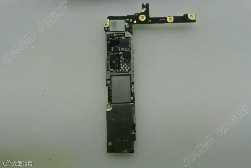 6 plus主板相对比上一代5S的主板更薄了,像摔过挤压更容易损坏,不过为了把机身做薄就不得不牺牲PCB板的厚度.主板背面中间那一块白色芯片就是16G的闪存芯片了