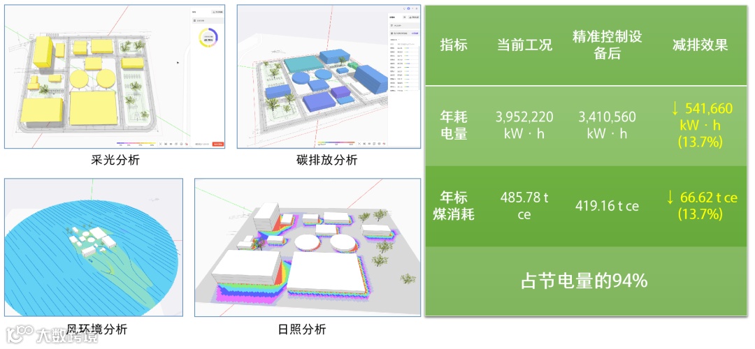 利用高精度BIM模型,对厂区进行风环境、日照、采光模拟,优化布局,提升环境舒适度。这些模拟分析深度融入设计流程,以轻量化方式高效驱动方案优化,保障水厂运行环境品质与设计效率。通过碳排放分析,优化设备选型与运行策略,预计每年可节电54万度,减少标煤消耗66.62吨,减排效果达13.7%。