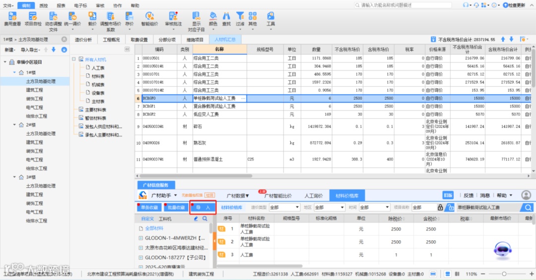 计价人材机汇总 → 广材助手 → 批量载价 → 选择目标价格库 → 一键完成多材料价格载入。