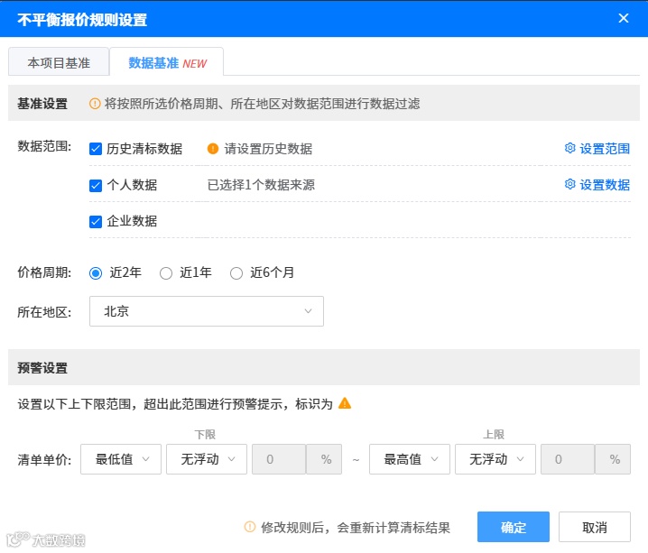 (3)切换到数据基准,勾选【历史清标数据】【企业数据库】,导入个人数据,点击确定。
