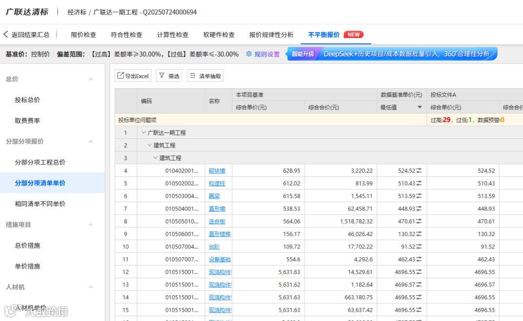 在原有不平衡报价的基础上,通过一键引入新数据辅助报价分析,利用deepseek精准匹配相同清单,360°高效分析,全面识别报价合理性风险!