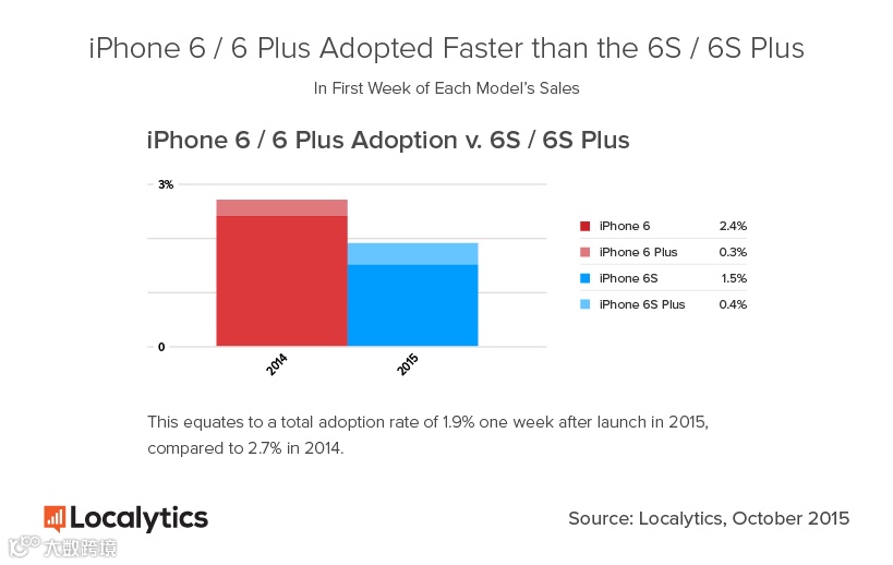 苹果公布 iPhone 6s/6s Plus 首周(三天)销量达到 1300 万部并创下新纪录之后,有分析师表示新手机的销量实际上并未增长。因为与去年相比,这一次首发名单里有中国大陆这个大市场。如今,又有一份新的报告指出 iPhone 6s 的初期市场不如 iPhone 6。威锋网消息,根据市场统计机构 Localytics 公布的数据,从上市后一周的表现来看,iPhone 6s 的升级率要低于去年的 iPhone 6。