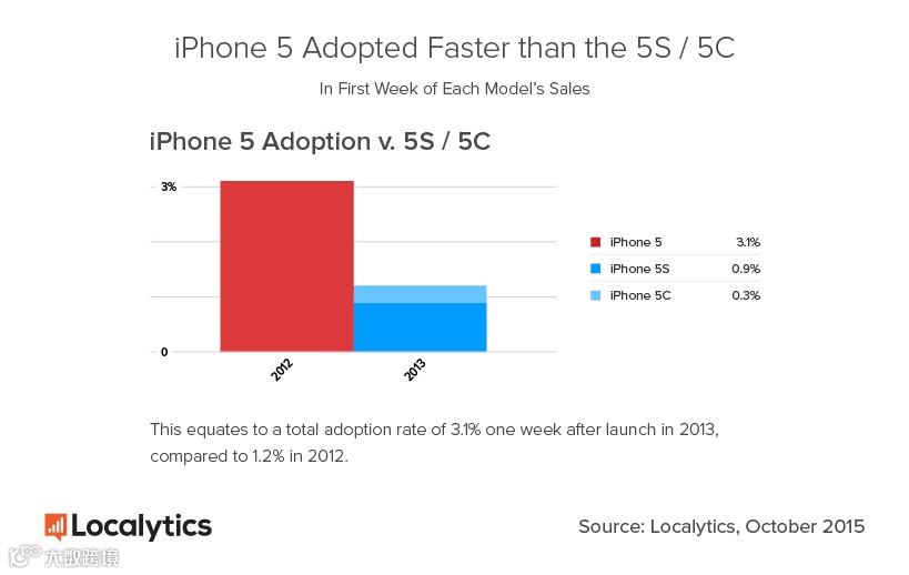 我们可以看到,2013 年 iPhone 5s 和 iPhone 5c 上市一周之后,其市场占有率分别为 0.9% 和 0.3%,远远落后于 2012 年 iPhone 5 的3.1%。