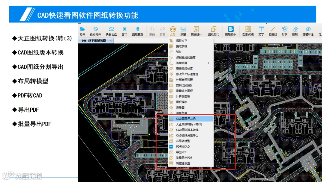 常用的图纸处理功能有:天正图纸转换(转t3)、CAD图纸版本转换、CAD图纸分割导出、布局转模型、PDF转CAD、导出PDF、批量导出PDF