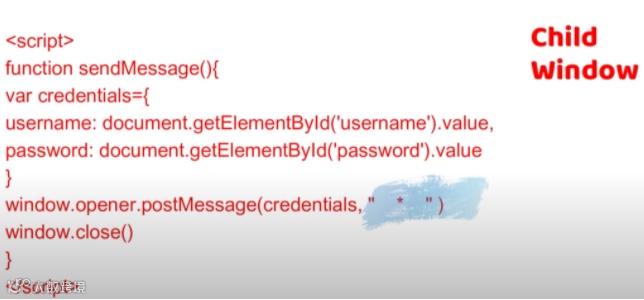 postMessage() 甚至允许从子窗口将消息发回给父窗口。在这种场景下,如果子窗口将通配符 (*) 指定为消息目的地的来源,则攻击者将能够捕获由子窗口发送的敏感数据:
