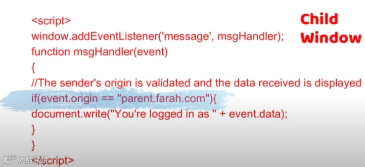 在理想情况下,安全的子窗口应该具有 if 语句,用来验证消息发送者匹配可信来源: