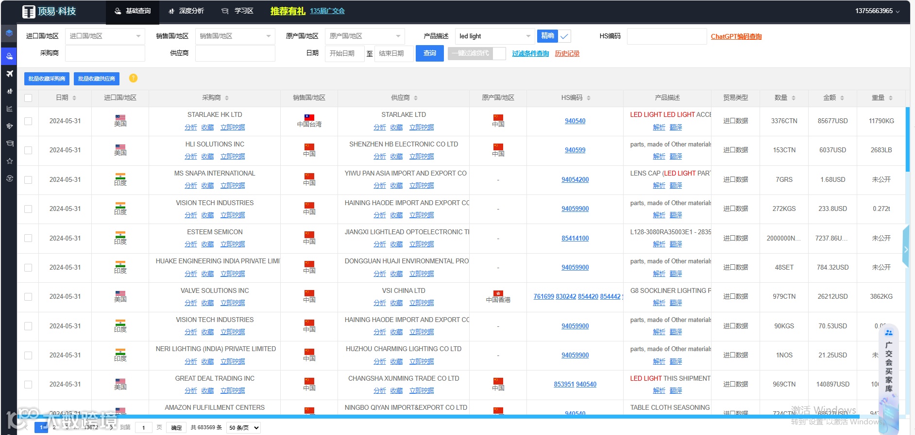 首先,假设我们是做led灯具的,那我们就可以在系统当中,输入我们的产品关键词,进行采购商的查询,找到专业采购咱们LED灯具的客户。