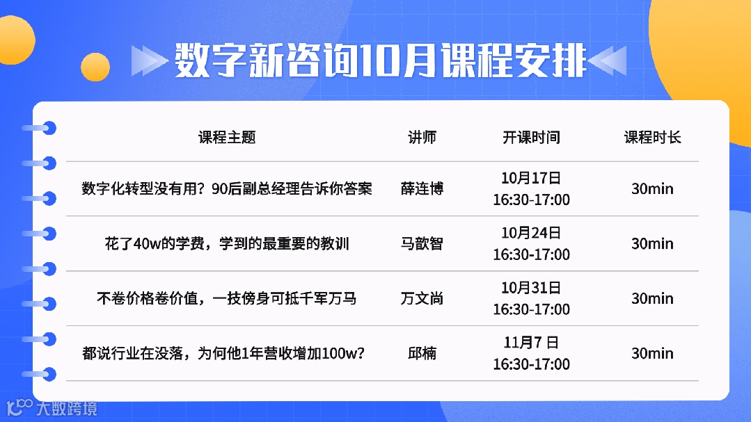 接下来的10月至12月,每周四16:30点都会有一节精品课程,千万别错过!