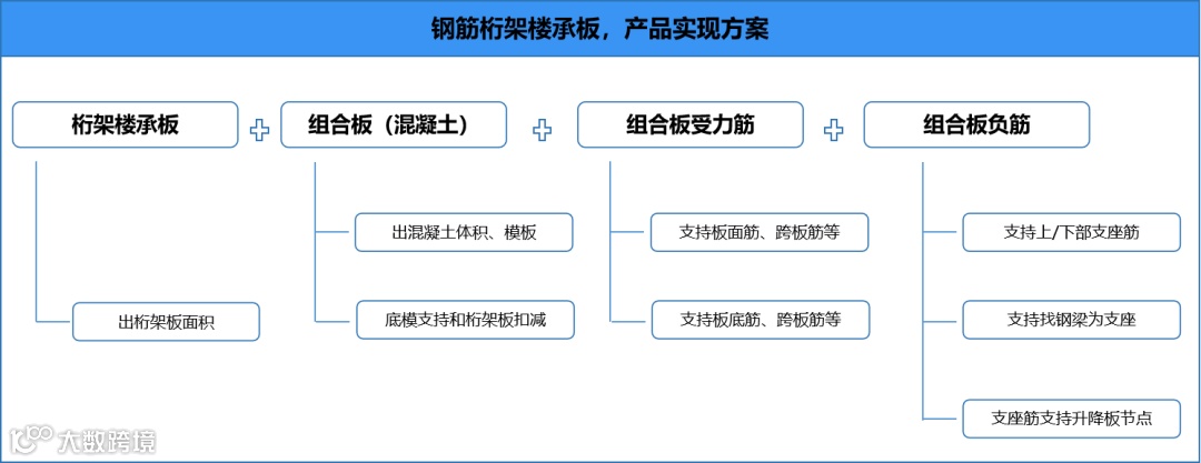 a、钢筋工程量:桁架筋钢筋类型多、造型复杂;长度也会根据实际板的大小而变化;有不规则板、斜板等;钢筋整体计算难度大;支座筋标注位置需找钢梁为支座、长度按规范取值,计算效率低;在升降板位置节点钢筋计算难度大;