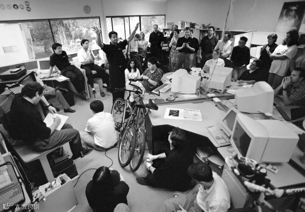 在 NetObjects 总部的一次员工会议上,Samir Arora 督促他的团队,要拥有自己对网页设计软件独特的见解。戴着气球帽的女士是一位新人,这是 NetObjects 公司传统的“欺负”新人的做法。他们认为这样做可以增进团队成员间的关系,这在高压的工作环境下非常重要。