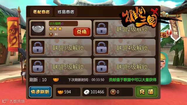 攻城掠地,战个痛快,主要目的就是为了换点儿贡献,去联盟商店买好东东。普通商店可以买到装备碎片、宝物碎片、进阶丹、洗炼石等道具,珍品商店则根据联盟所占领的城市,产出高级将魂、天神令等珍稀物品,两处商店均可使用贡献抢购,手要快喔。