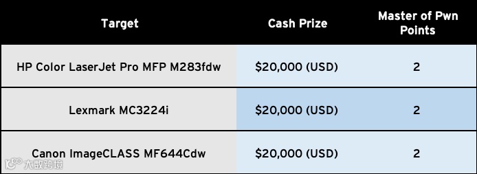 大赛选手必须从选手设备对目标的被暴露网络服务发动攻击。大赛囊括了近期最热门的三款 LaserJet 打印机。