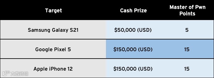 该类别还包括了额外奖金。如果选手的 exploit payload 以内核级别权限执行,则可获得额外奖金5万美元以及5个额外积分点。也就是说内核级别权限的完整的 iPhone 或 Pixel 浏览器 exploit 将获得20万美元的奖金。