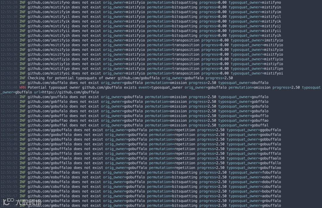 pkgtwist 最重要的部分很可能是生成良好的用户名排列,从而增加检测到typosquat 的几率。一番研究后,我进入zntrio/typogenerater,它看似是生成潜在用户名输入错误的完美程序包。该程序包执行了非常长的排列策略,我从中挑选了一些,因此 pkgtwist 仅检查我认为最可能是输入错误的情况即可: