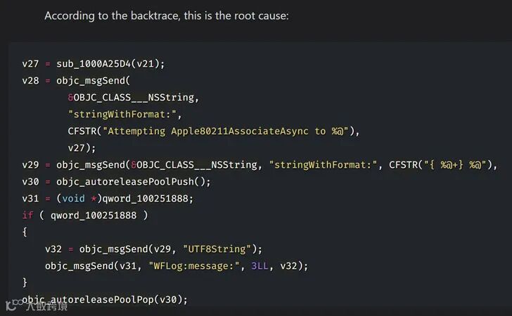 有研究人员认为,造成该 bug 的原因在于,iOS 解析 SSID 输入方式中的字符串格式化 bug触发了进程中的拒绝服务。这名研究员认为该漏洞不可利用,因为要触发该 bug,必须连接到该 WiFi,而SSID对于受害者而言是可见的。WiFi 门户钓鱼页面可能是更有效的方式。