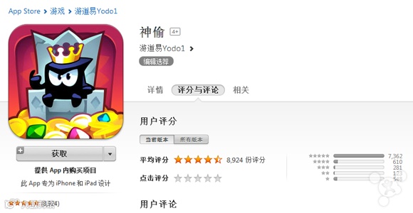 《神偷》上架当天凭借着苹果编辑推荐头条和新作的人气,在春节期间一度挤上 iOS 免费榜榜首,但是随后游戏的下载排名就一路下跌,玩家好评度虽然很不错,但是受到休闲游戏的定位限制,加上游戏本身并没有在前期广告投入过,所以下载量在 AppStore 新作档过去之后就再难提升。
