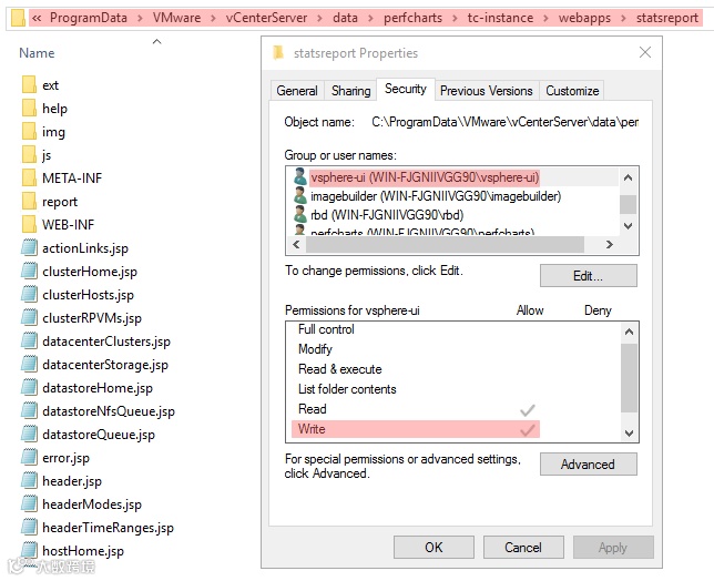 在搜索候选位置时,目录 C:\ProgramData\VMware\vCenterServer\data\perfcharts\tc-instance\webapps\statsreport\ (含有 .jsp 文件)看起来不错。