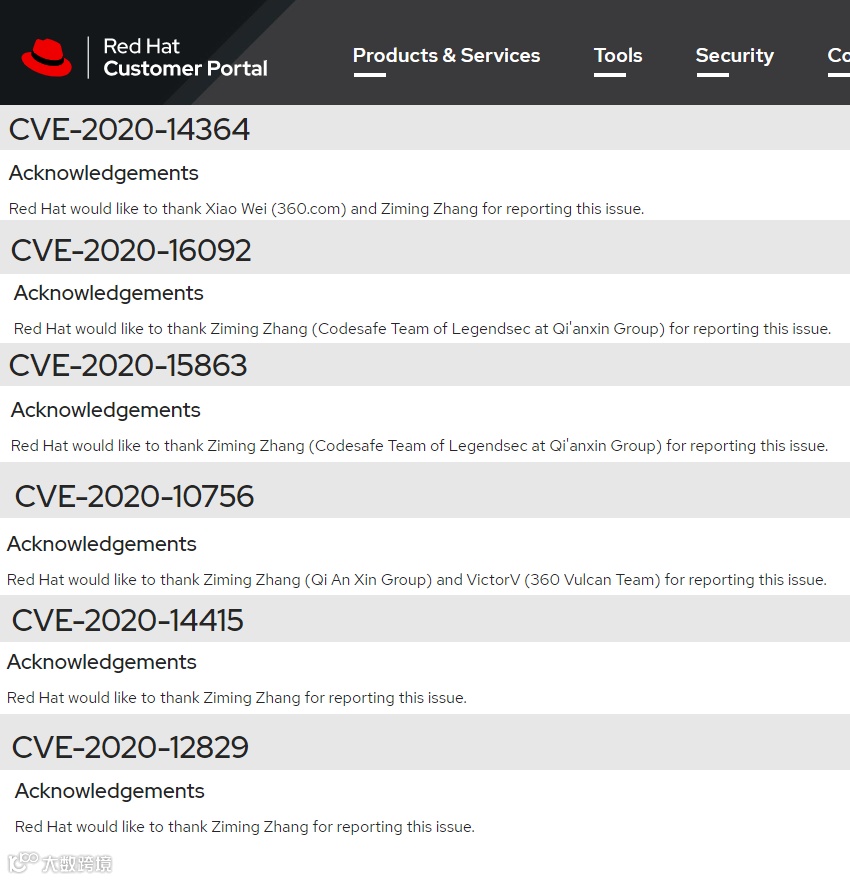 奇安信代码安全实验室研究员为Red Hat发现六个漏洞(CVE-2020-14364、CVE-2020-10756、 CVE-2020-12829、 CVE-2020-14415、 CVE-2020-15863和CVE-2020-16092),其中CVE-2020-14364 被评估为具有“重要影响”。研究员第一时间向Red Hat报告且协助其修复漏洞。