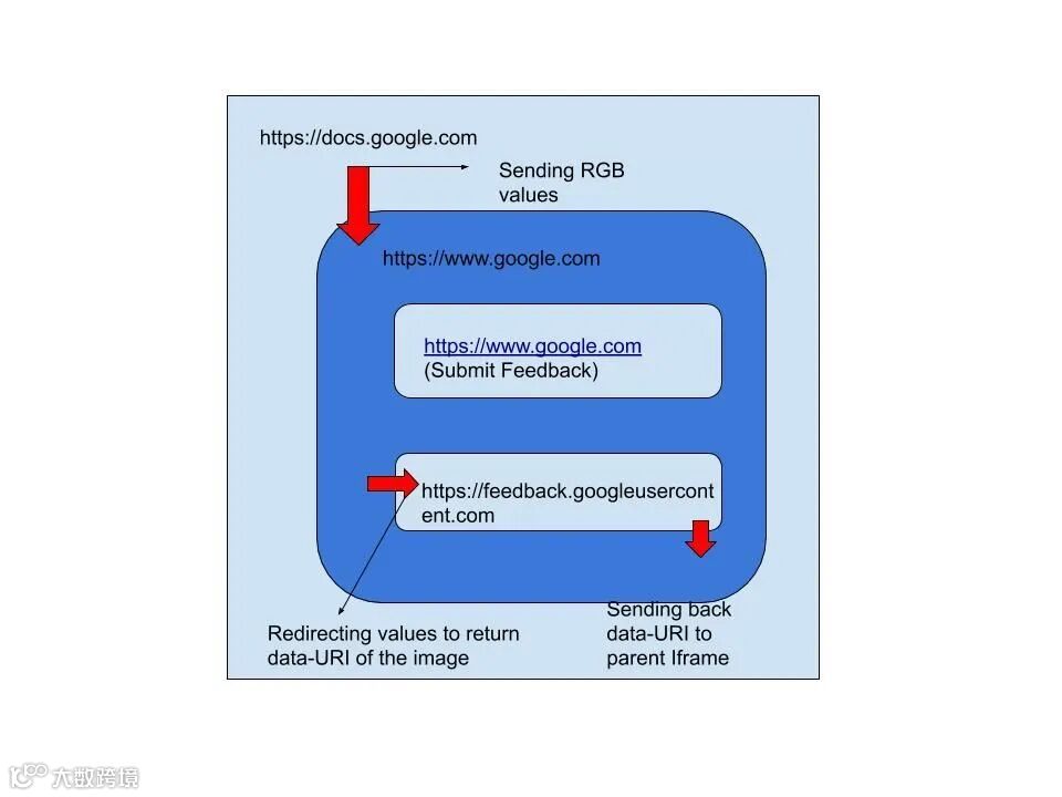 我们假设使用 Google Docs (https://docs.google.com/document) 提交反馈的流程:首先,导航到 Help--> Send Feedback,之后你会看到一个 iFrame 弹出并魔术般地加载你正在处理的文档截屏。由于该 iframe 的来源 (www.google.com) 不同于 Google Docs (docs.google.com),因此要成功地渲染该截屏,肯定存在某种跨来源通信方法。这时候,PostMessage 就派上用场了!工作流基本应该是:Google Docs 通过 postmessage 将每个像素的 RGB 值发送给主 iframe (www.google.com)中,之后将这些 RGB 值通过 postmessage 发送给它的 iframe (feedback.googleusercontent.com),之后从那些像素中渲染图像并将 base64 编码的数据-URI 发送回主 iFrame。