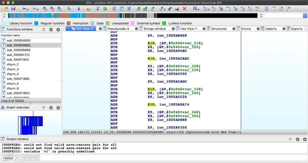 下载并提取 unc0ver IPA 后,我将主可执行文件加载到 IDA 中进行分析。遗憾的是,该二进制被深度混淆,因此我无法以静态的方式找到该 0day。