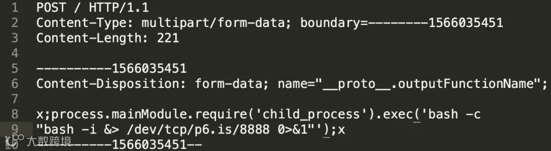 以上所示的 payload 利用的是express-fileupload 中的原型污染,并下令 EJS(如使用)发布 Node.js 的一个“child__process”。这一新发布的进程将进一步使攻击者获得反向 shell。