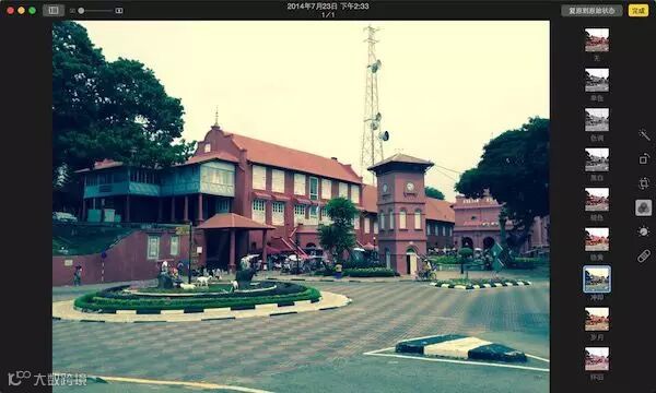 滤镜方面照片应用提供了 8 个,分别是单色,色调,黑白,褪色等。
