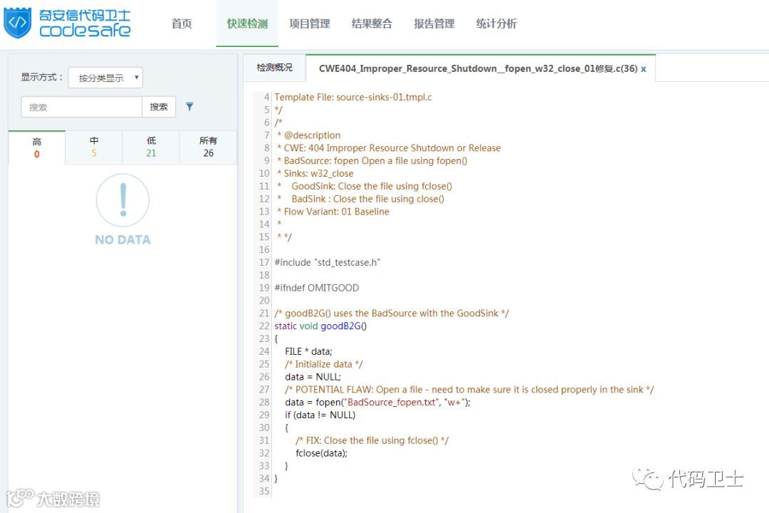 使用代码卫士对上述示例代码进行检测,可以检出“错误的资源关闭”缺陷,显示等级为高。如图1所示: