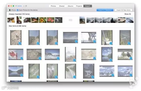 和 iPhoto 类似,当你连接一部相机,iOS 设备,或者媒体卡/读卡器的时候,导入按钮就会出现。点击后你就可以选择导入所有新的项目。如果连接了超过 1 台设备-iPhone 和 SD 卡的话,你可以从弹出的菜单中选择来源,并导入这些图像,或者是兼容的影片。