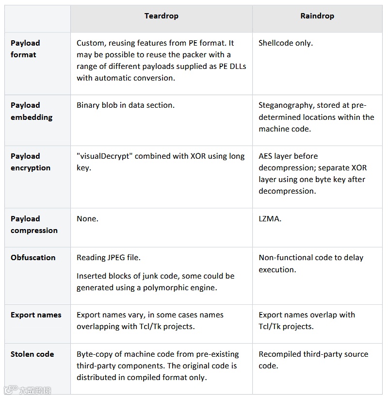 但是,虽然 Raindrop 和 Teardrop 的目的相同,但赛门铁克公司表示二者之间还是存在一些差异,最显著的是代码层面的差异,如下表所示: