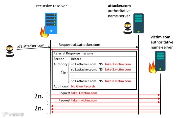 研究人员发现可以利用这些大量不必要的消耗诱骗递归解析器强制向目标域名而非合法的权威服务器发送大量数据包。