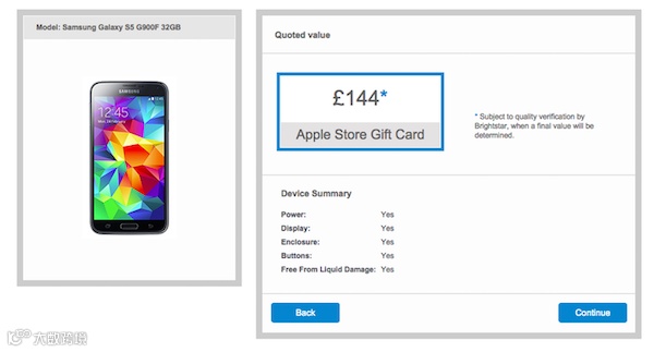 苹果在欧美国家推出的非 iPhone 回收计划是苹果称霸智能手机市场的下一步策略。当然,仅凭这项回收计划来刺激消费是不可能的,就算苹果官方不推出此类活动,想置换的依然会通过第三方服务来置换,不想置换的未必会因为苹果官方推出的服务而产生置换念头。苹果一般通过与第三方合作回收非 iPhone 手机,然后提供相应金额的苹果零售店礼品卡。比如在英国,苹果跟一家叫 Brightstar 的服务商合作,用户可以亲自拿起苹果零售店估计,或者在网上先估价。如图这部 32GB 的三星 Galaxy S5,估价约 144 英镑(折合 1326 元人民币)。