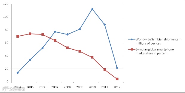 收购后,诺基亚将塞班开源。当时塞班的系统份额超过 50%。2008 年,第一款安卓手机上市,当时市场份额只有 0.5%。两年后,谷歌的安卓系统市场份额越来越大,于 2010 年第四季度首次超过塞班系统。后来的故事大家都知道了,谷歌的安卓系统超过并取代塞班成为目前市场份额最大的操作系统。而塞班则于 2012 年退出了历史舞台。