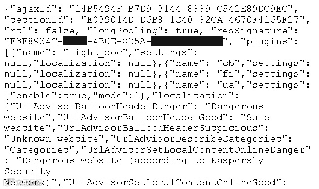 知道“signature”之后,任何网站都能够通过加载如https://ff.kis.v2.scr.kaspersky-labs.com/<SIGNATURE>/init?url=https://www.google.com/这样的地址初始化会话。这里的前缀 “ff” 是火狐浏览器特有的,在 Chrome、Edge和 IE 浏览器中,它就是 gc、me和ie。我们声明是在https://www.google.com/中被注入的脚本,不过这其实也没啥关系。我们从响应中得到很多 JSON 数据:
