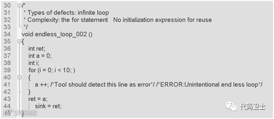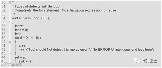 上述示例代码中在第39行使用 for 语句进行循环操作,且在 for 语句中省略了循环控制变量,在 for 循环体中也没有对循环控制变量进行更新,从而导致死循环的发生,因此存在“不当的循环终止”问题。