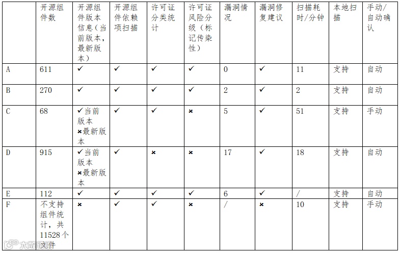 注4:每家算法实现方法不同,有些扫描源码,有些扫描二进制码;有些直接上传到云端进行扫描,有些需要本地部署客户端,有些需要集成到开发环境使用;有些侧重漏洞信息,有些侧重开源许可证信息。