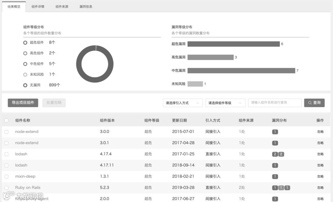 工具E扫描结果:112个开源组件数,有组件版本信息,有依赖项扫描,6个安全漏洞,有许可证分类统计,有许可证风险分级,支持本地扫描,自动确认