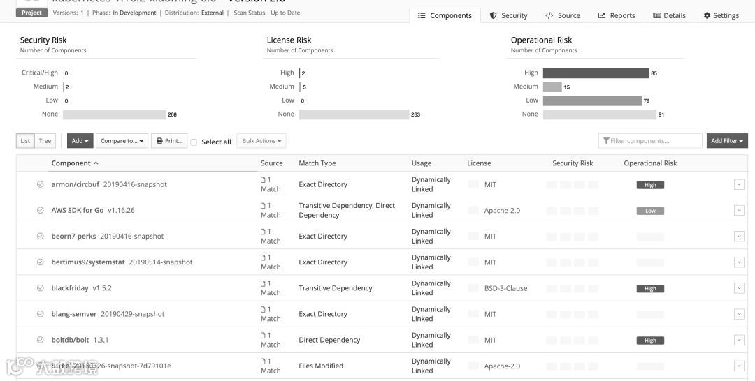 我们选取了kubernetes 1.16.2版本来进行开源治理工具扫描对比。目前kubernetes是一个开源中主流的容器编排软件,市场占有率超过80%,国内开发的容器编排软件基本基于kubernetes开发。