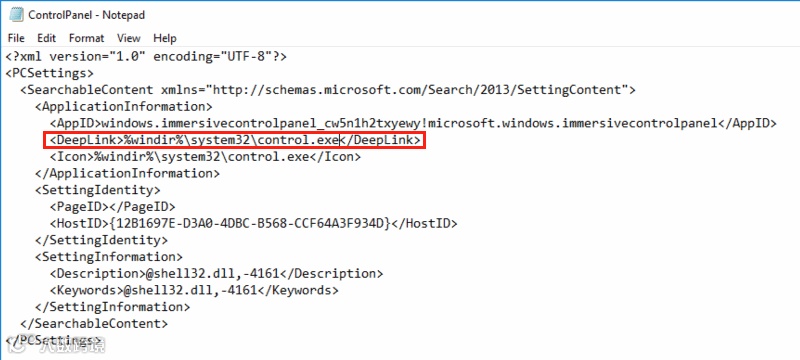 所有的 SettingContent-ms 文件均为 XML 文档,其中包含 标签,明确了用户双击快捷方式时将要打开的 Windows 10 设置页面所在的磁盘位置。