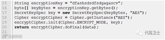上述代码操作是使用硬编码密钥对原文进行加密的过程。首先第15行给定一个密钥字符串,16~17行根据给定的密钥字节数组和AES算法构造一个密钥对象,第18行同样使用AES算法实例化加密类。第19行使用加密模式对密钥对象进行初始化。第20行通过加密操作,返回加密后的字节数组。当程序中使用硬编码加密密钥时,所有项目开发人员都可以查看该密钥,甚至如果攻击者可以获取到程序class文件,可以通过反编译得到密钥,硬编码加密密钥会大大降低系统安全性。