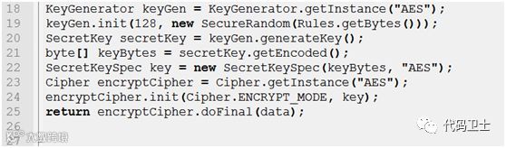 在上述修复代码中,在第18行构造密钥生成器,指定为AES算法,不区分大小写。第19行根据传入的字节数组生成一个128位的随机源,第20行产生原始对称密钥,第21行获得原始对称密钥的字节数组。KeyGenerator类作为密钥生成器可替代硬编码密钥。