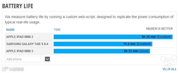 一如往常,苹果并没有列出 iPad mini 3 的电池参数,但外媒基于前后两代平板的机身尺寸没有太大变化考虑,初步推测后者与前者的电池容量基本相同。外媒采用了与 iPad Air 2 电池续航测试相同的条件,结果出人意料的发现 iPad mini 3 的续航时长仅为 6 小时 28 分,比前代平板的电池续航时间少了 1 小时 35 分钟,如此大的差异显然推翻了此前的预测。