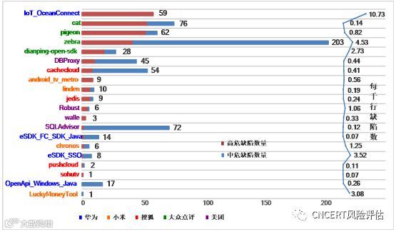 考虑到项目的绝对缺陷数量可能与项目大小相关,因此本报告计算了每千行缺陷数,用该数据反映缺陷在项目中的分布密度。根据该数据,代码安全性最好的前5个项目依次是华为的eSDK_FC_SDK_Java(0.07),搜狐的sohuTV(0.07)、PushCloud(0.11),美团的SQLAdvisor(0.12)和大众点评的cat(0.14)。而缺陷分布密度相对较高的项目是华为的IoT_OceanConnect(10.73)、eSDK_SSO(3.52),大众点评的zebra(4.53)、dianping_open_sdk(2.73)和小米的Lucky MoneyTool(3.08)。可以看到,不同项目的缺陷密度差别巨大,其中华为的eSDK_FC_SDK_Java项目平均大约每1.5万行代码会出现一个缺陷,而同样是华为的IoT_OceanConnect项目平均大约每100行代码就会出现一个缺陷。