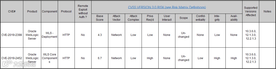 本次Oracle公司本次修复的漏洞中,CVE-2019-2398 和 CVE-2019-2452影响多个WebLogic大版本(10.3.6.0、12.1.3.0、12.2.1.3等),由于系统在对文件操作校验存在缺陷。在一定条件下,成功利用此漏洞的攻击者可以达到目标系统的远程代码执行。建议用户及时更新补丁进行修复。