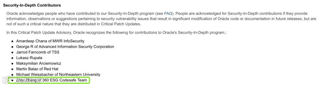 “安全纵深防御”计划是 Oracle 公司在2008年7月发布的“关键补丁更新”中推出的。如果研究人员提供的与安全漏洞相关的信息、意见或建议促使Oracle 代码或文档的未来版本进行重大修改但其严重程度尚不足以导致在“重要补丁更新”中发布这些修改,则会授予研究人员该称号。目前仅有为数不多的中国安全研究员获此殊荣。