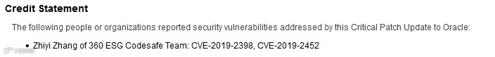 近期,360企业安全集团代码卫士团队安全研究人员发现 Oracle 公司旗下产品 Oracle WebLogic Server 的多个安全漏洞(CVE-2019-2398,CVE-2019-2452),并多次第一时间向Oracle公司报告,协助其修复漏洞。