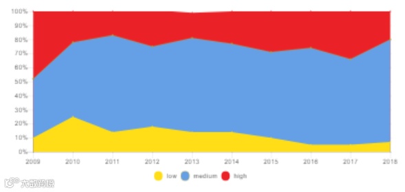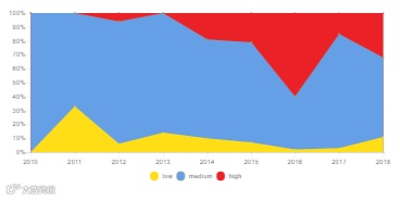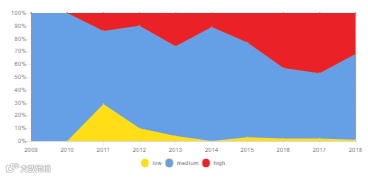 Java 是唯一一种在去年开源漏洞数量见涨的语言。令人吃惊的是,2018年Java 的漏洞数量几乎是2017年的两倍。Java 语言的中危漏洞占比稳定在75%,不过在过去两年中其高危漏洞数量也在增加,在2018年占比达到20%。如图: