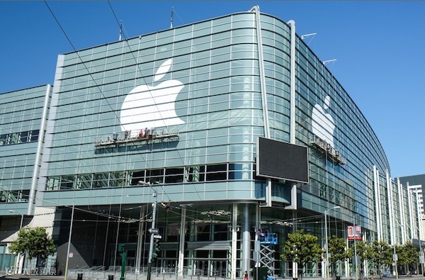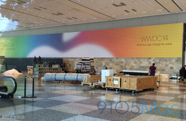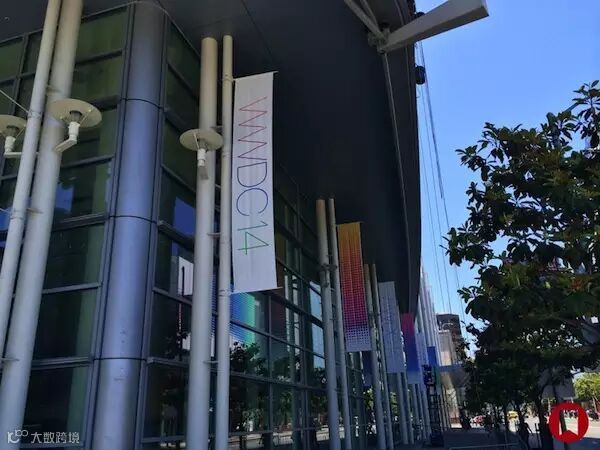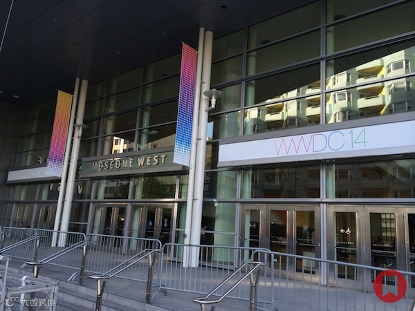 苹果每年的WWDC都选择在莫斯考尼西中心举行,会场的布置包括外围玻璃的苹果logo和海报、门口的旗帜和内部的巨大横幅。